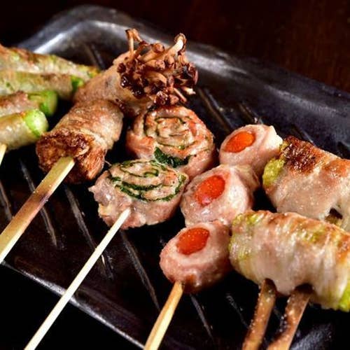 ネギ間、皮、ハツ、アスパラ、ぼんじり、サバ、ワサささみ、しいたけ、白レバ、つくね、
